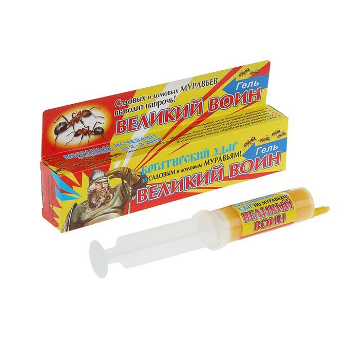 Ситуация кардинально меняется благодаря новому средству «Великий Воин — гель против садовых муравьев». Этот гель — приманка с двумя веществами, губительными для муравьев. Специальный состав ее так привлекателен для насекомых, что рабочие особи не только охотно поедают ее сами, но приносят в муравейник и кормят личинок. Благодаря этому уже через несколько дней погибает вся муравьиная колония.