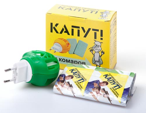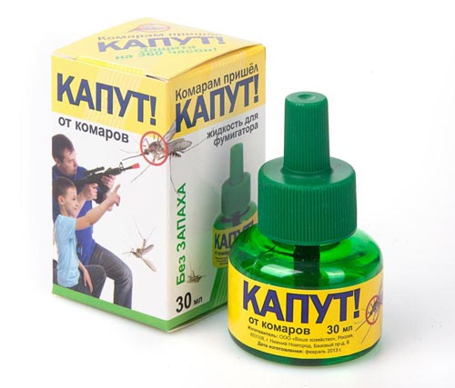 «Капут» — жидкость для фумигатора для уничтожения комаров в помещении.Полная гибель комаров в помещениях — через 20-30 мин в зависимости от площади.