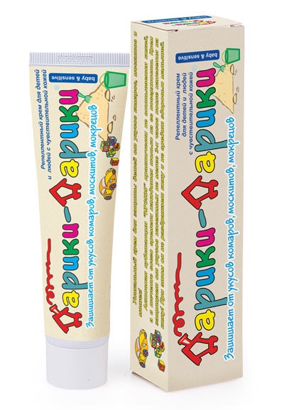 В качестве действующего вещества содержит субстанцию «IR3535», производимую немецкой фирмой «MERK». Это вещество (практически единственное в мире) обладает отличными репеллентными свойствами и самой низкой токсичностью для кожи. Дело в том, что оно практически не впитывается кожей, а в течение всего времени находится только на ее поверхности. Препараты, сделанные на его основе, разрешены даже для детей от одного года! Раньше при разработке детского репеллентного крема производители никак не могли решить проблему противоречия между эффективностью и безопасностью продукта. Хорошо отпугивающие насекомых крема были небезопасны для детей, а те препараты, которые рекомендовались для малышей, обладали, увы, лишь слабым репеллентным действием. Крем «Дарики-Дарики» — это уникальное сочетание мягкой, безопасной для детей формулы и высокой эффективности. Он защищает детей и подростков от укусов насекомых не менее трех часов после нанесения н